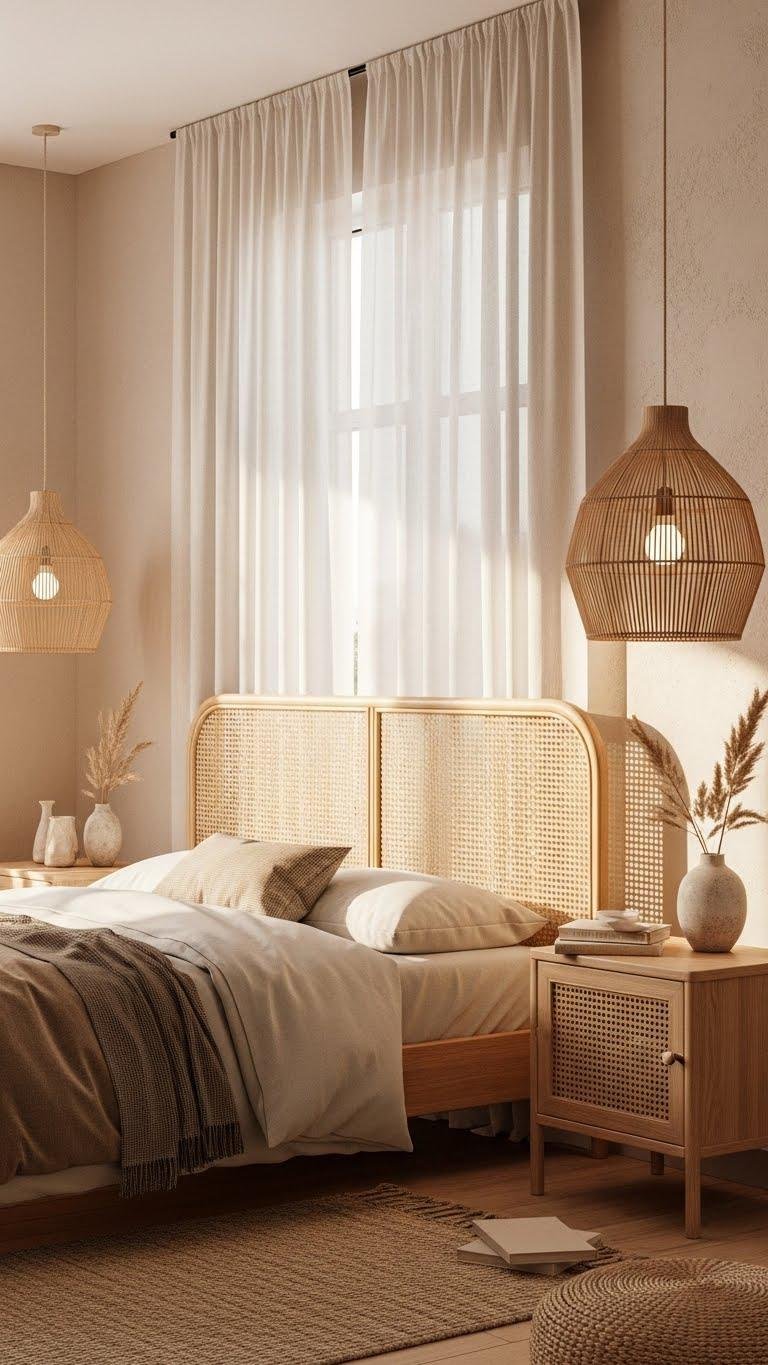 Woven accents add instant warmth and tactile contrast to a warm-minimal space, so pick rattan pieces that read clean and sculptural rather than ornate. You’ll layer freedom-forward texture with rattan lamps for soft glow and woven headboards that anchor the bed without visual weight.