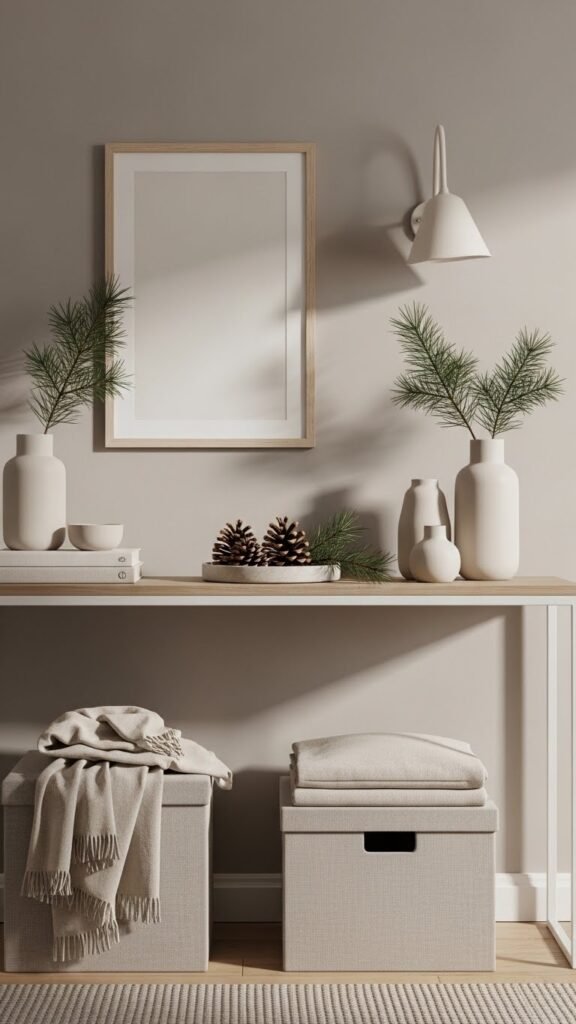 You’ll layer soft beige accents with natural pine sprigs, a simple pinecones arrangement on a tray, and matte ceramics.