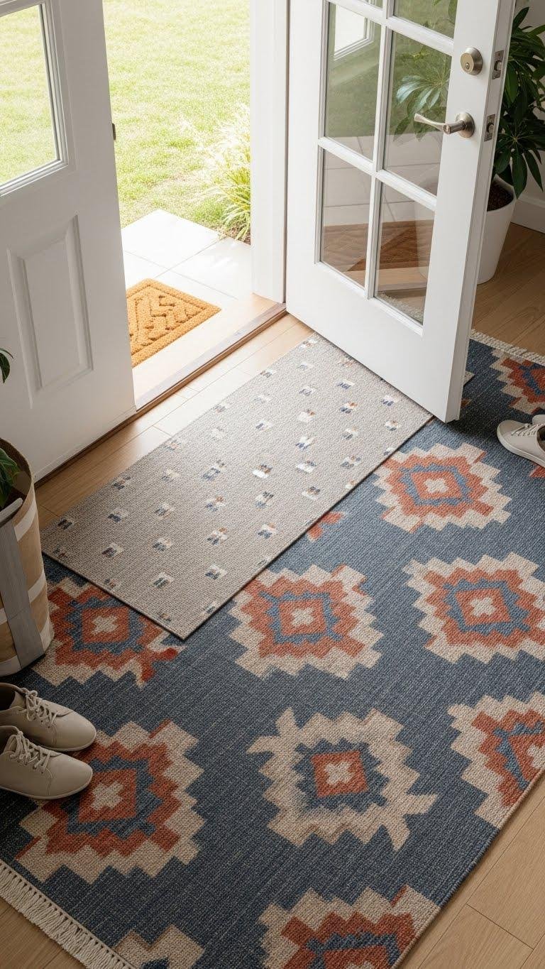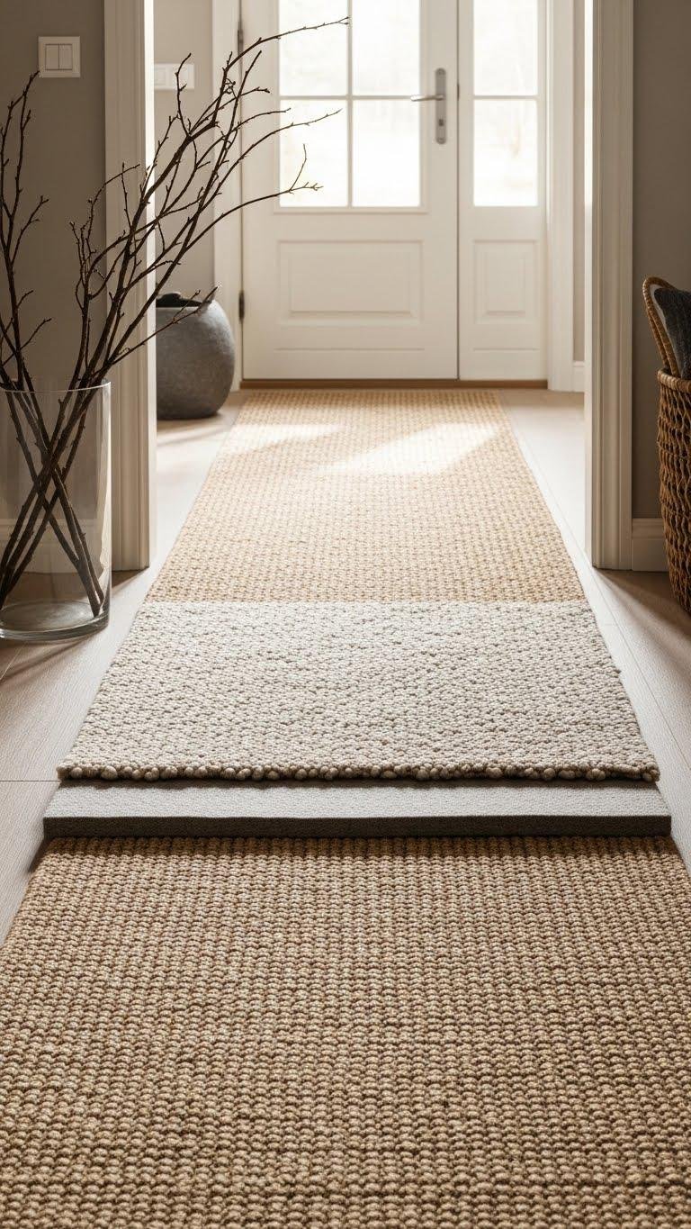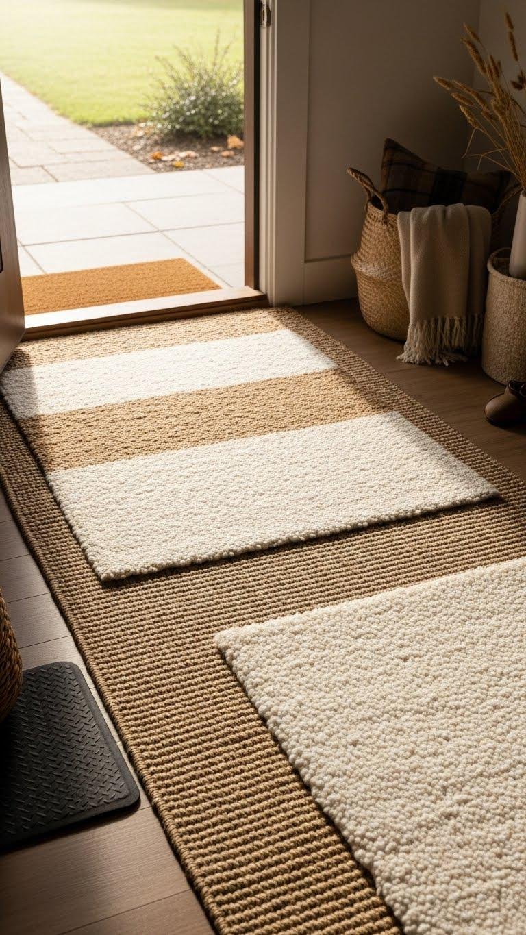 Layer layered rugs to instantly add texture and warmth to your entry without crowding the space; pair a low-pile sisal or jute base with a softer wool or faux-shearling runner to create contrast underfoot and define the walkway.