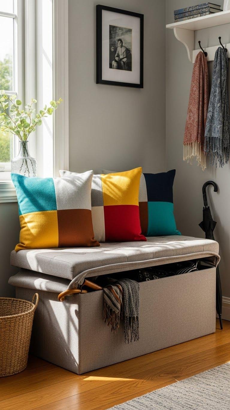 A plush storage bench gives your entryway a dual-purpose upgrade: you get a cozy spot to sit while putting on shoes and a tidy hideaway for scarves, mittens, and umbrellas. Choose upholstered storage for sleek, durable comfort, then pile colorblocking cushions to express personality and energy.