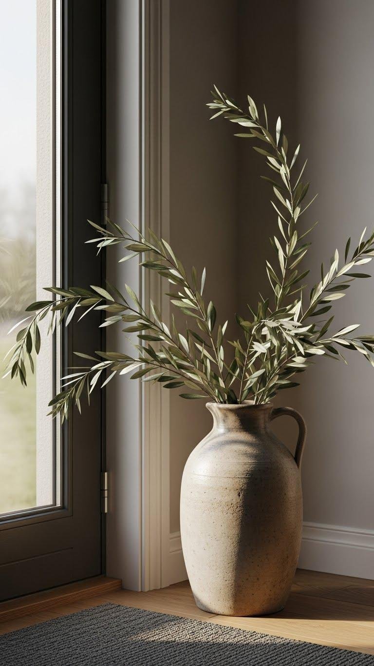 Olive symbolism lends calm resilience; the arrangement feels deliberate, low-maintenance, and open. It welcomes guests without fuss, signaling simple comfort and the freedom to live lightly indoors.
