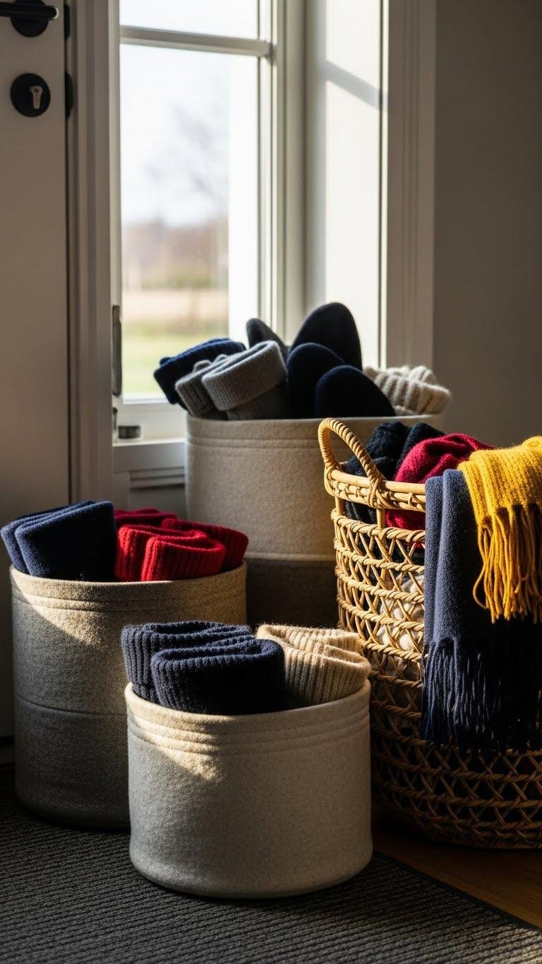 Corral mittens, hats, and scarves in a single woven basket by the door so everything is grab-and-go on chilly mornings. Choose felt baskets for soft protection and neat stacking, or mix textures with rattan entry baskets for a breezy, unfastened look. You’ll stay organized without fuss, reclaiming time and movement—simple storage that supports a free, lived-in routine.