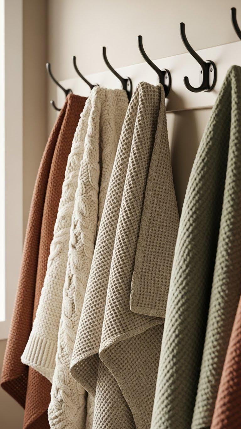 Layer layered knit throws on a row of sturdy hooks to turn simple storage into a textured focal point—drape one chunky cable knit over a lighter waffle weave, letting corners peek for contrast. You’ll create layered textures that feel intentional, not fussy.
