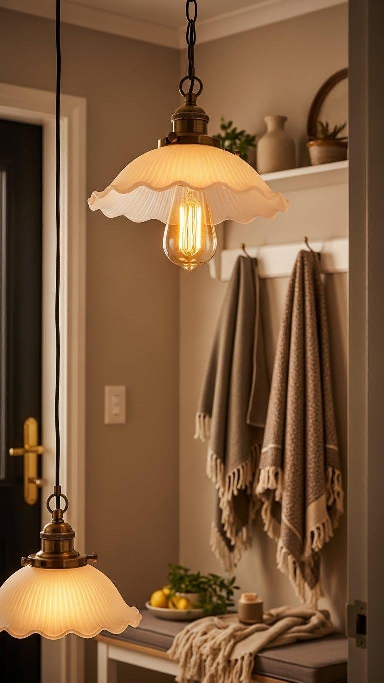 Choose an antique brass fixture with Edison bulbs for warm glow, or a scalloped shade in frosted glass to diffuse light softly.
