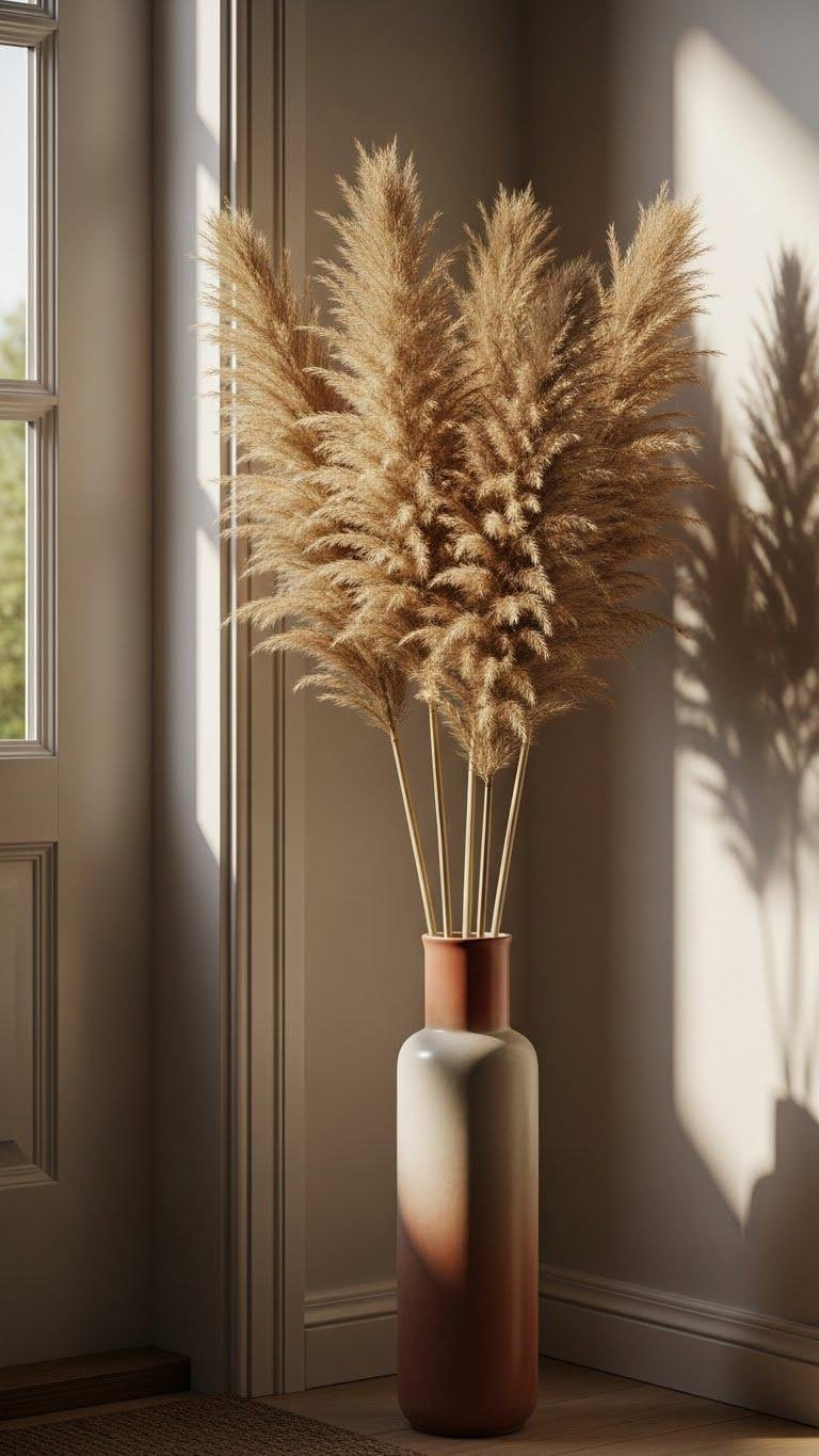 You’ll love how dried pampas adds movement without maintenance, its feathery plumes contrasting a sleek ceramic silhouette. Place it near the door to claim airy height, free up floor space, and signal a relaxed, intentional welcome every time you come home.