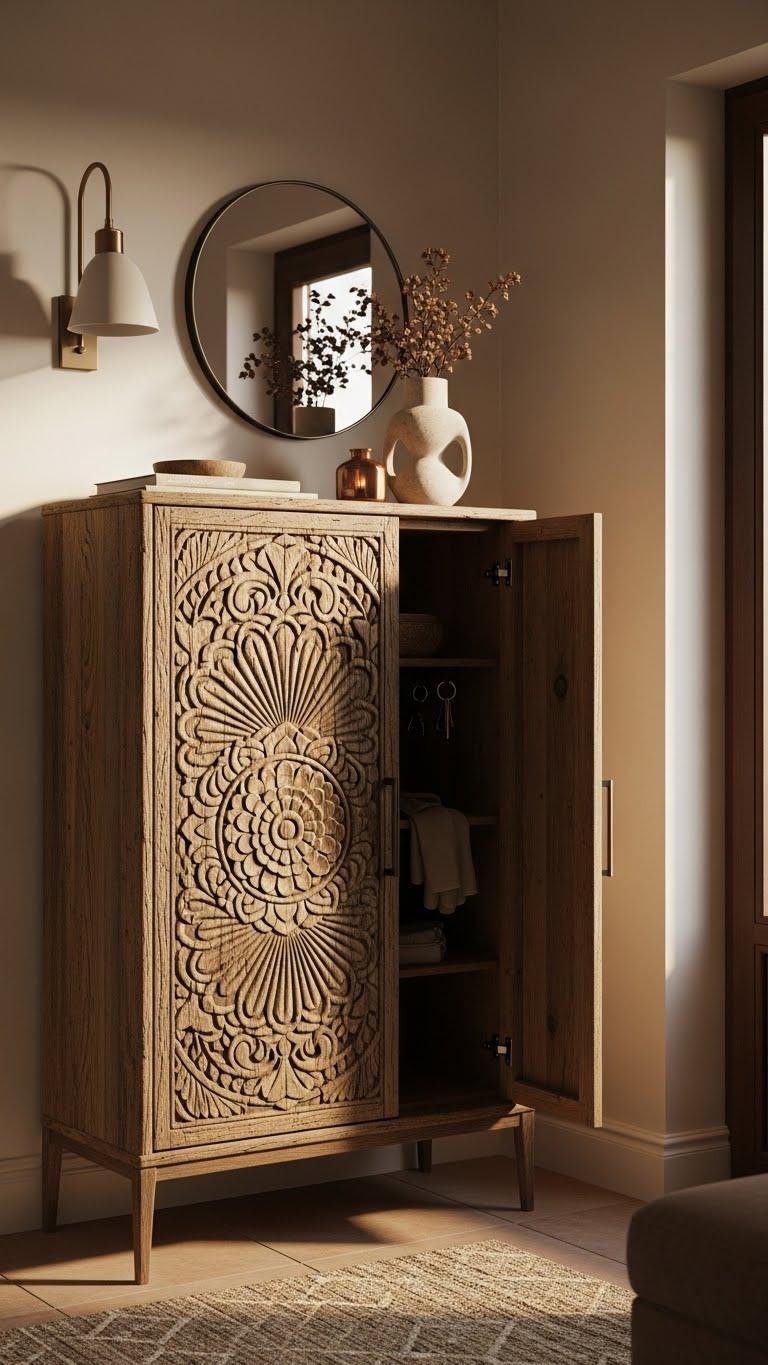 When you bring a carved wood cabinet into the entry, it anchors the space with sculptural warmth while keeping clutter out of sight.