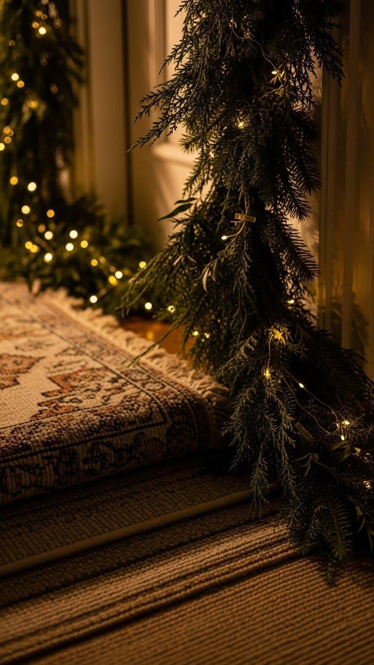You can keep the layered-rug look glowing after dark by weaving tiny, warm twinkle lights through garlands and evergreen swags along the entry. Tuck a candle safe twinkle strand into foliage, mix in a battery operated garland for effortless control, and fasten discreetly with clips. You’ll create a liberated, inviting welcome that’s low-maintenance, safe, and effortlessly chic.