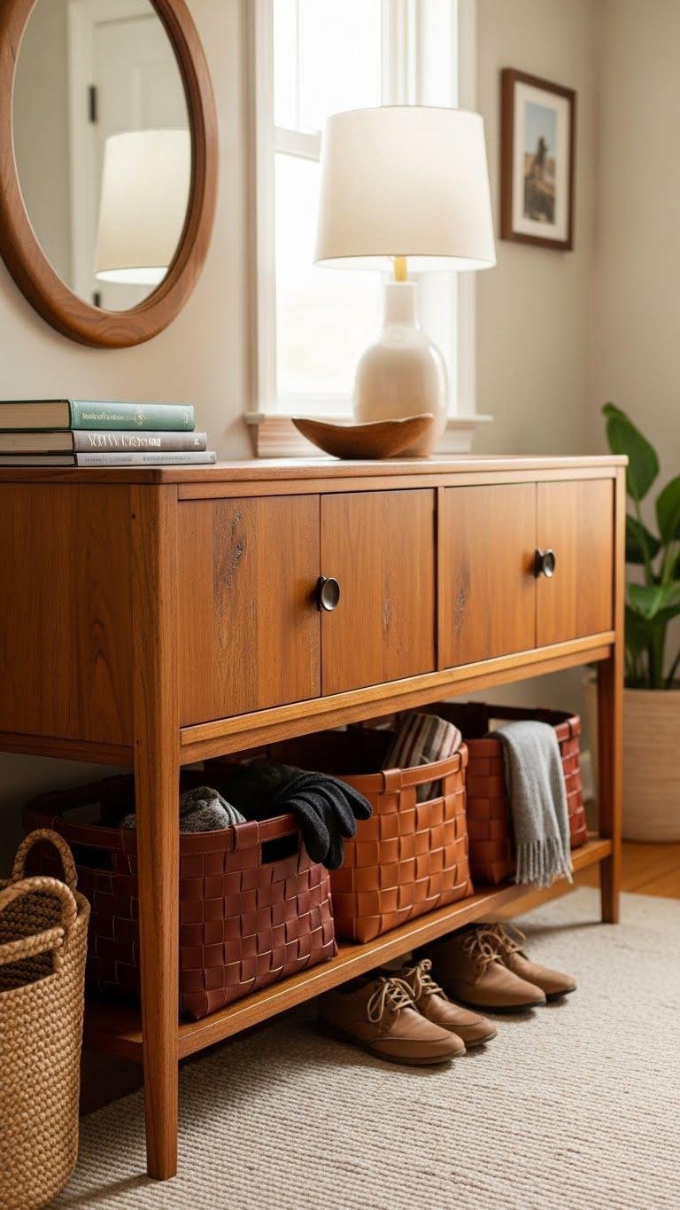 If you liked the soft comfort of a storage bench, consider swapping in a vintage wood console to bring warm character and practical catch-all storage to your entryway. You’ll love the distressed patina and clean lines — it anchors the space without weighing it down. Tuck woven leather baskets beneath for shoes, scarves, and gloves, keeping the zone tidy and ready for adventure.