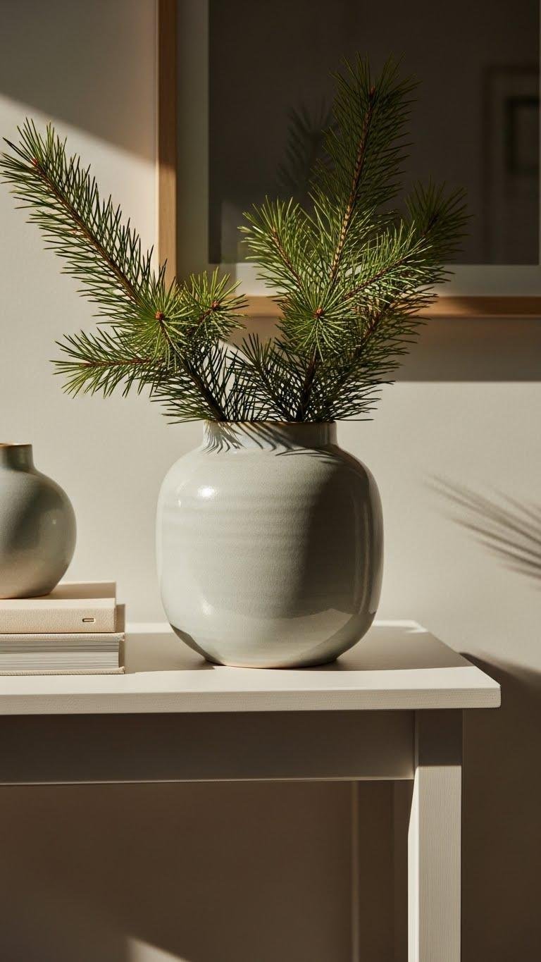 When you swap out seasonal bouquets for a simple ceramic vessel filled with fresh pine stems, the entryway instantly feels cleaner and more deliberate. Choose a matte or subtly glazed texture to add quiet sheen without fuss.