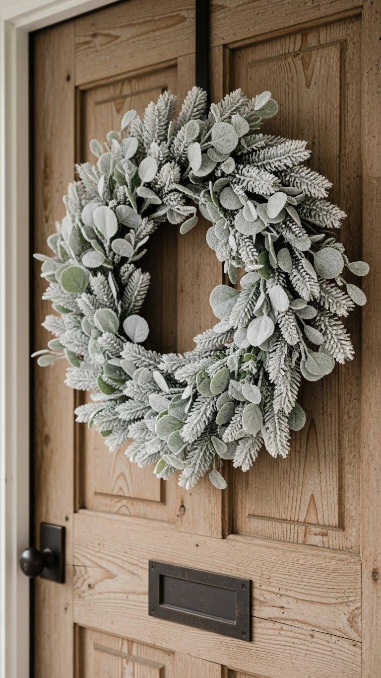 Swapping the soft green of pine stems for a snow-dusted wreath brings a more tactile, storybook feel to your entryway while keeping that same calm, curated look. You’ll hang a hand painted wreath on a reclaimed door, pairing icy eucalyptus and powdered faux needles for contrast.