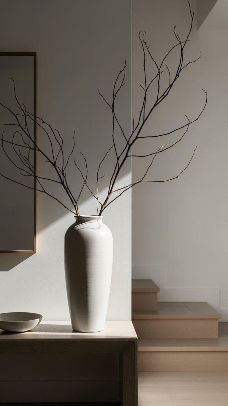 Anchor your entryway with bare branches in a statement vase to create instant sculptural interest without clutter. You’ll embrace a minimalist silhouette that reads modern and free. Choose tall branches for drama, a weighted vase for balance, and keep surrounding surfaces clear. The result is elegant textural contrast that feels effortless, welcoming, and easy to change with the seasons.