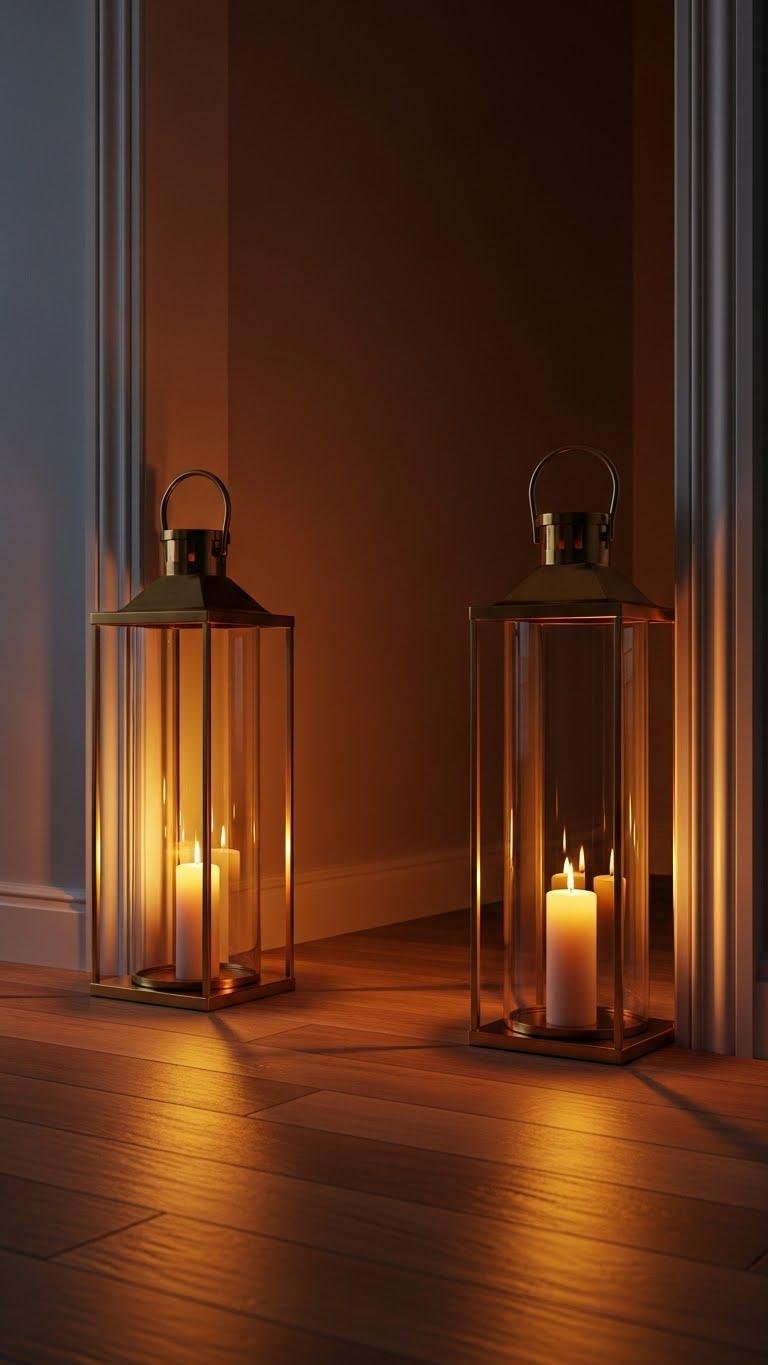 Place a pair of gold hurricane lanterns near the door to cast a warm, welcoming glow that immediately elevates your entryway. You’ll pair brass accents with clear glass for a modern, liberated vibe. Use sturdy tapered candles to avoid drips and choose LED versions if you want low-maintenance warmth. Position them symmetrically to frame the entrance and invite guests with effortless style.