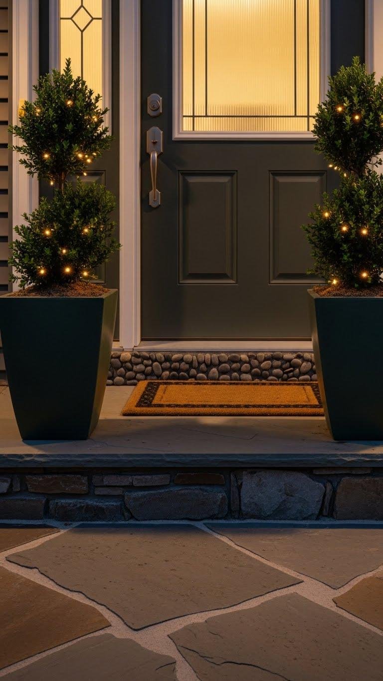 Frame your doorway with a pair of mini evergreens to give the entry instant structure and seasonal charm. You’ll position matching mini topiaries in sturdy evergreen planters for symmetry and easy upkeep. Choose simple pots, secure with sand or stones, and tuck a string of waterproof lights for subtle glow. This clean, confident look invites guests while staying low-maintenance and free-spirited.