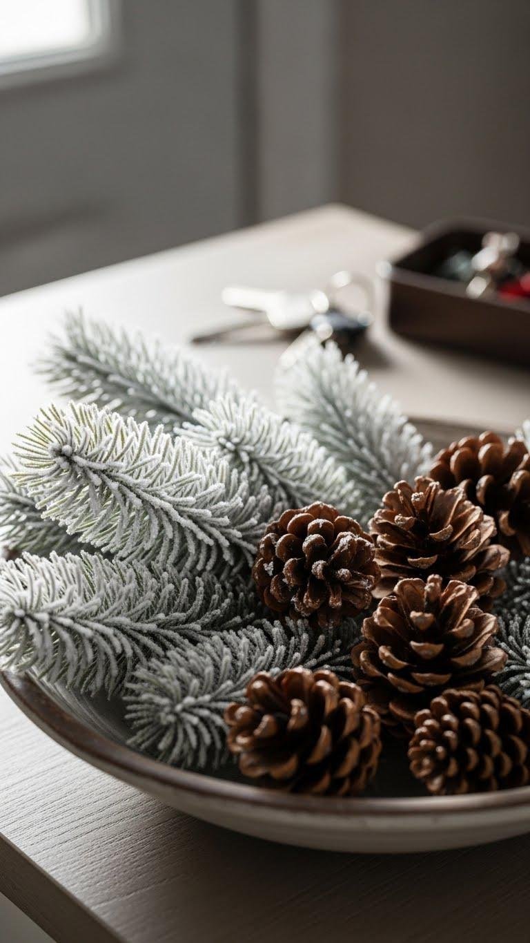 Tucked into a shallow bowl, flocked pine sprigs and assorted pinecones bring winter’s quiet texture to your entry without fuss.