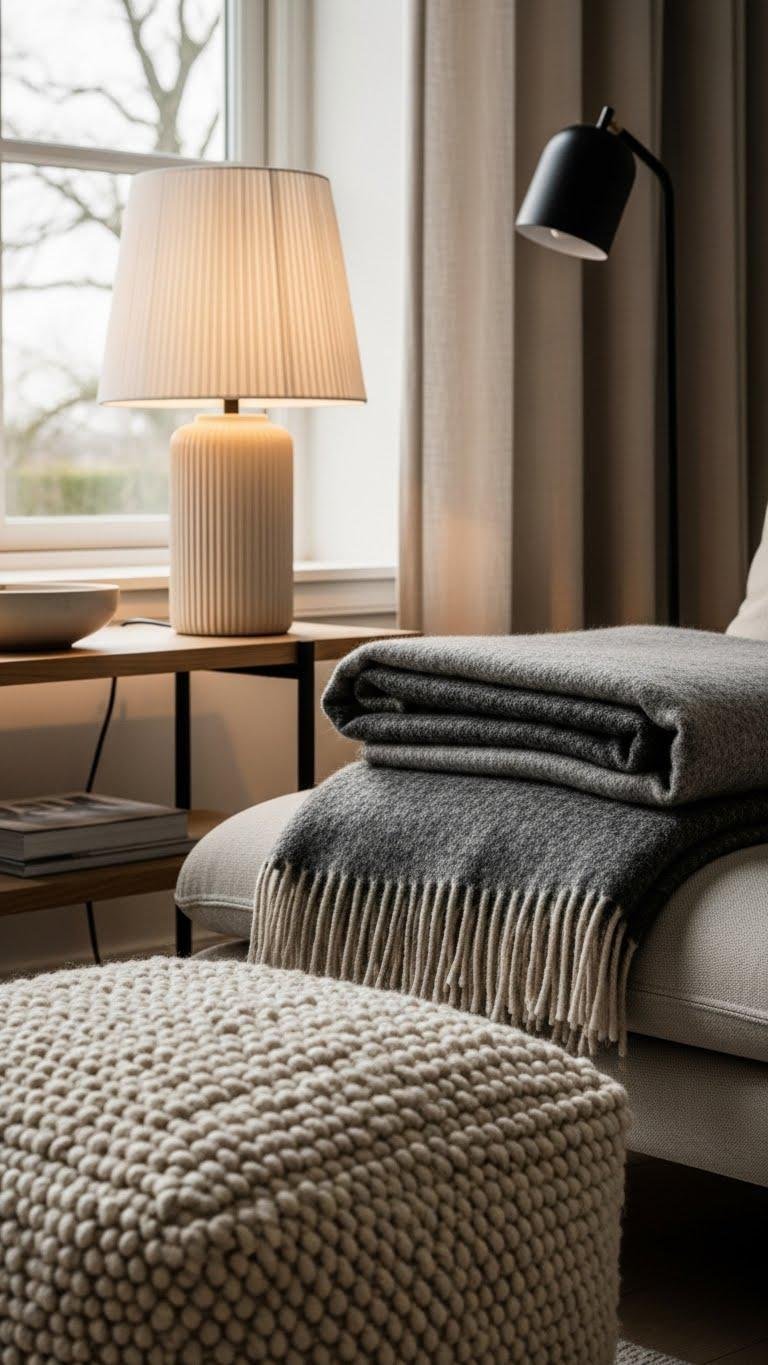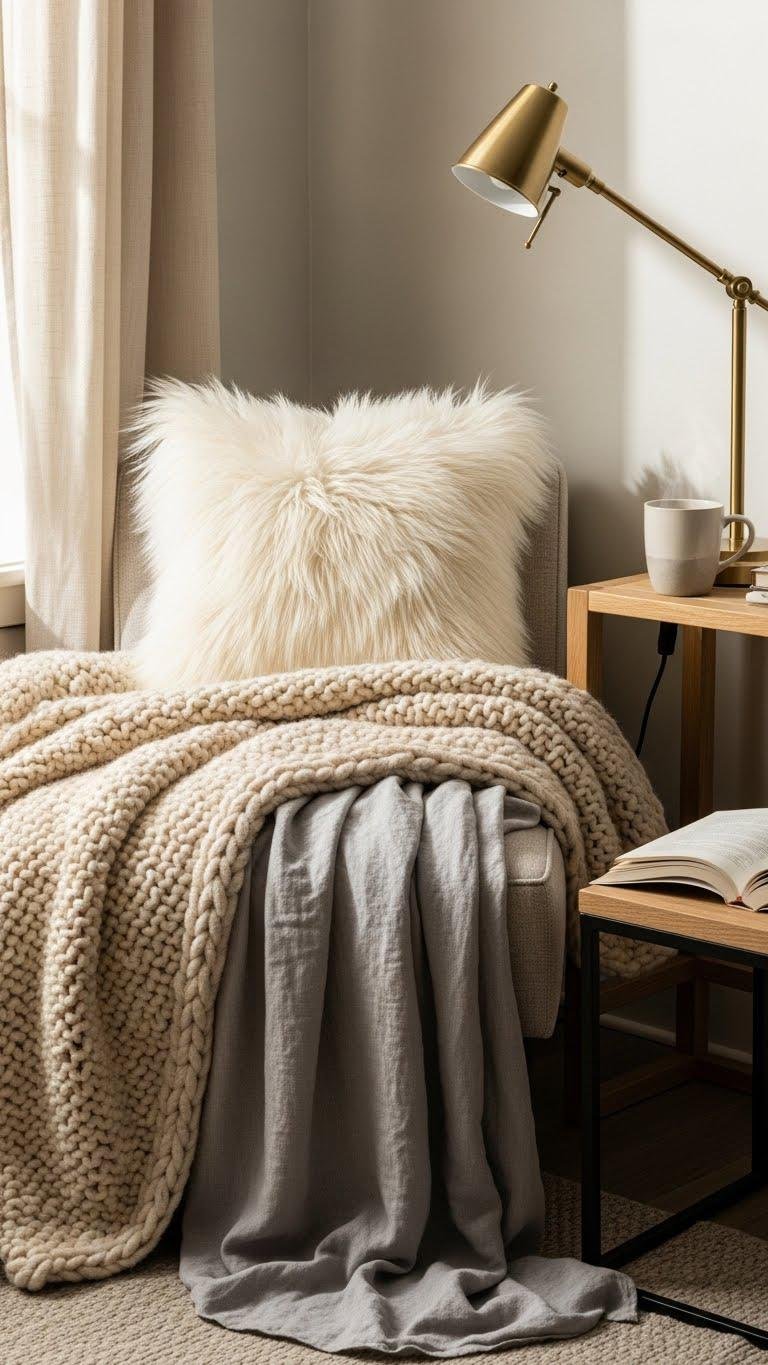 For curling up with a good book, layer plush throws over a compact armchair or window seat to turn a spare corner into your favorite retreat. Choose breathable textures, mix a chunky knit with a lightweight throw, and add a faux fur pillow for luxe warmth.