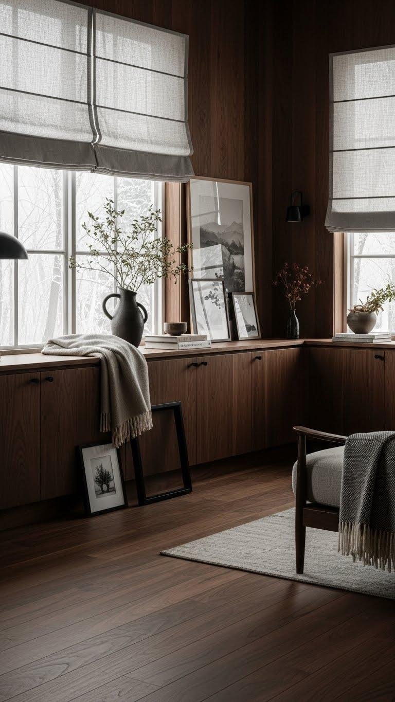 You’ll welcome deep walnut floors and furniture to anchor rooms without feeling heavy. Mix ebony accents in hardware and frames for contrast, keep simple silhouettes, and let rich grain and matte finishes create a liberated, refined winter mood you can live freely within.