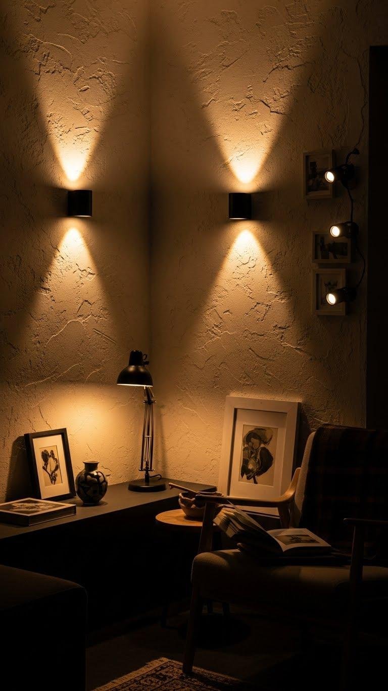 Textured walls make a room feel tactile and sculptural, but lighting gives that texture life — it defines depth, mood, and how you experience each surface.