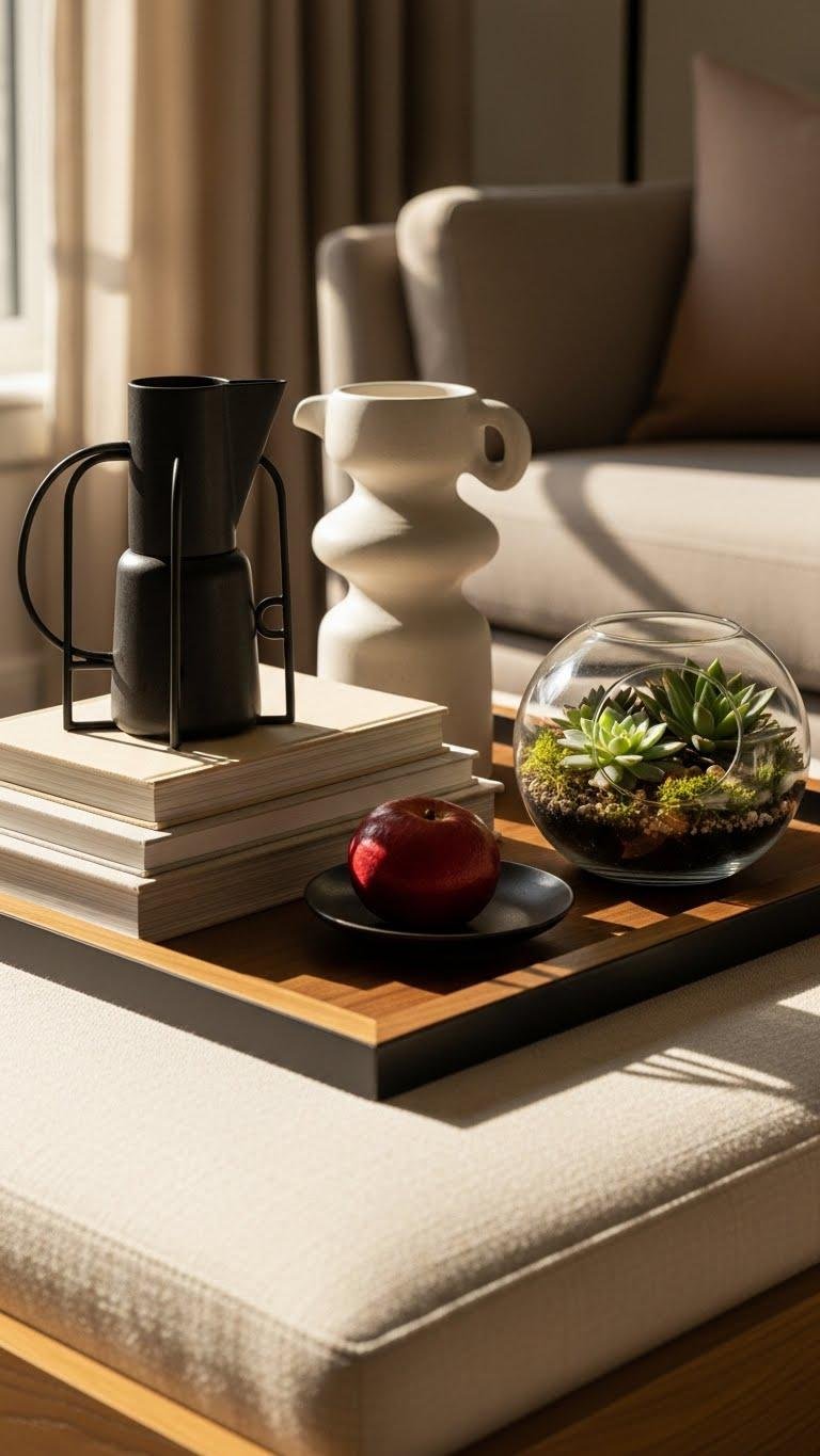 Set up a curated tray vignette to anchor a coffee table or ottoman and give your cozy space a considered focal point. You’ll combine a sculptural tea set, a neat book stack, and a mini terrarium for texture and calm. Add seasonal fruit for color and impermanence. Keep proportions balanced, surfaces tidy, and elements removable so your space stays liberated and refined.