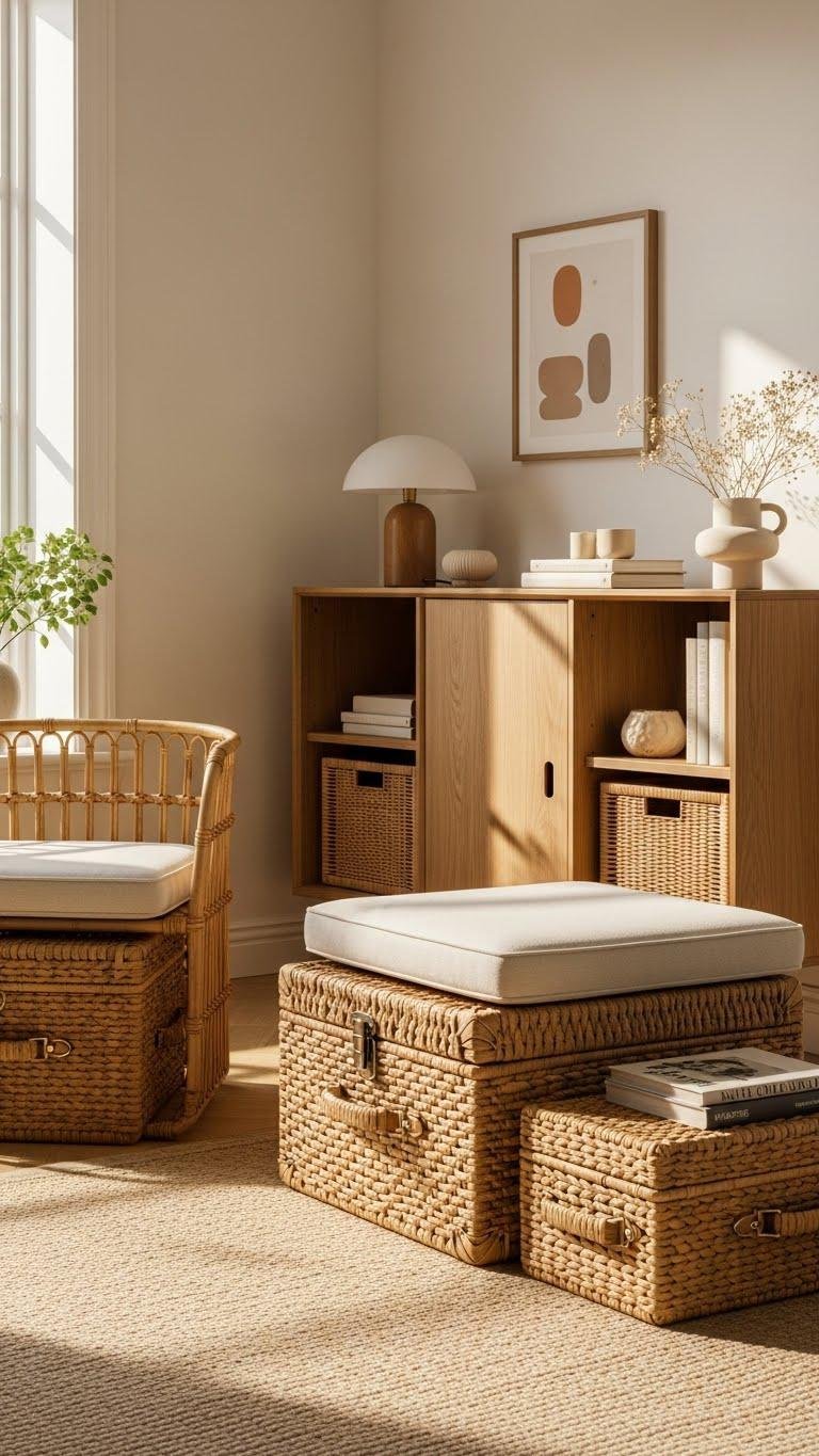 When you marry form with function, storage becomes a design gesture rather than an afterthought. You’ll choose hidden baskets to tame clutter without sacrificing style and place woven trunks as sculptural anchors that double as seating and luggage. Opt for clean lines, tactile materials, and modular pieces that free your space and mind. Practicality shouldn’t feel restrictive; it should feel liberating.