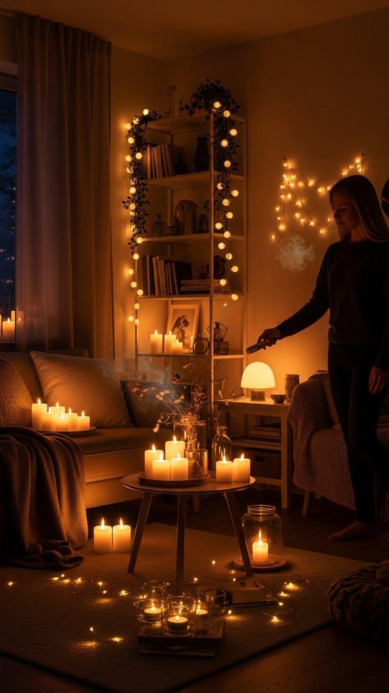 Dim the overheads and layer soft light close to the body of the room to make evenings feel instantly calmer; candles, string lights, and low lamps give you that intimate, textured glow that hard fixtures can’t.