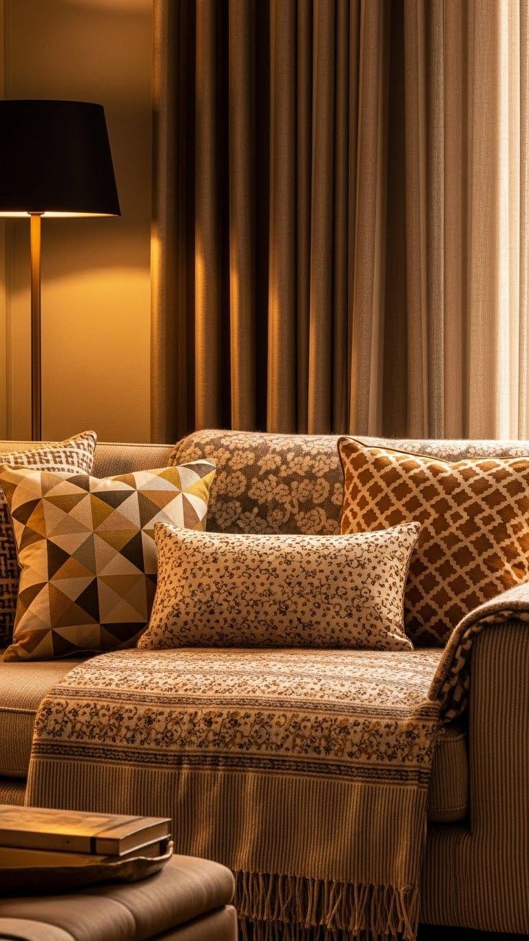 Warm metallics have set the scene; now let pattern take over to envelop the room in a cocooning embrace. You’ll embrace pattern layering across upholstery, throws, and curtains, mixing motifs that share a restrained palette.