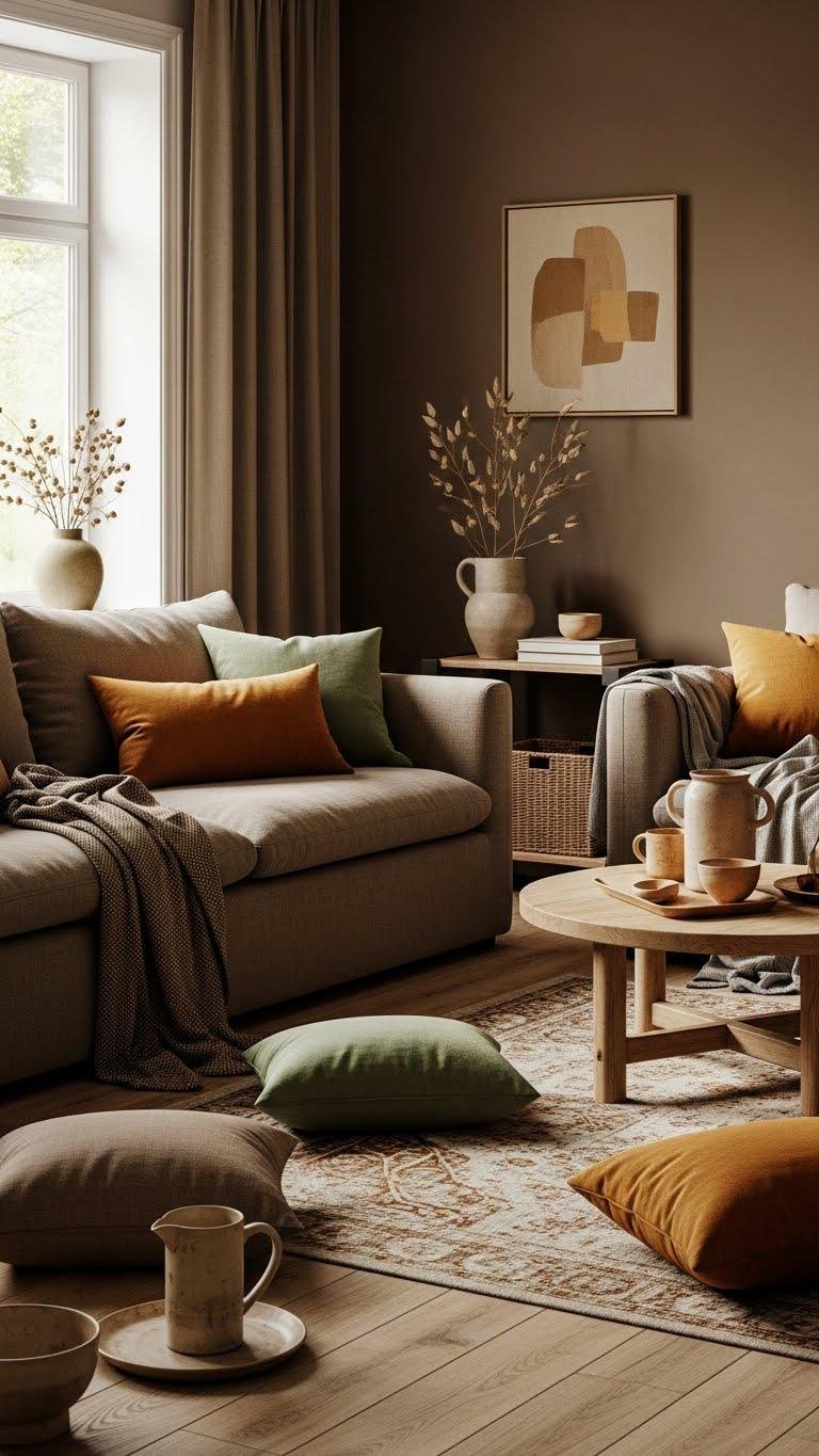 When you layer warm browns, muted ochres, and soft moss greens, your living room instantly feels grounded and inviting.
