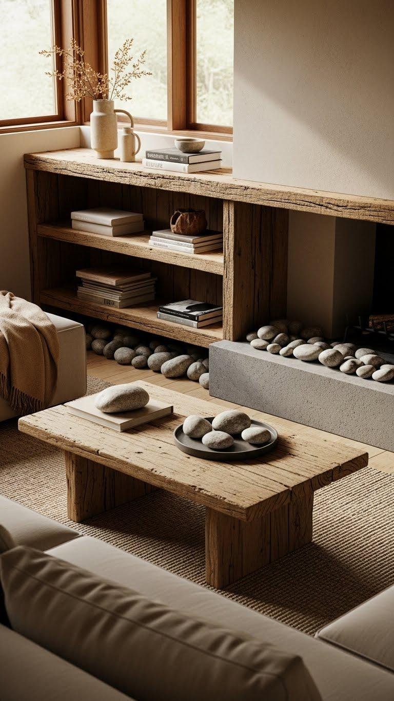 Layer reclaimed timber shelving, a simple coffee table, and accents of river stone to ground your layout. You’ll mix rough and smooth finishes, create visual contrast, and keep the room feeling open, honest, and effortlessly free.