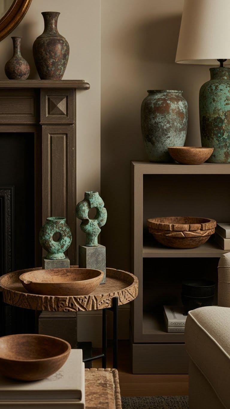 Adding patinated decorative pieces brings depth and history to a cozy winter living room, and you’ll find they anchor modern elements with a quietly worn elegance. Choose oxidized metalware, carved bowls, and sculptural objects with verdigris accents to introduce texture and story. Place them sparingly—on mantels, shelves, or side tables—so each piece breathes and invites relaxed, unfettered living.