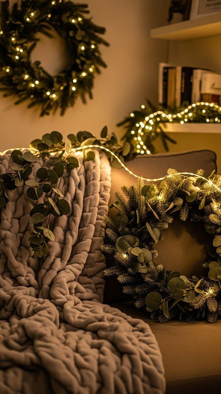 After you’ve layered in a weighted blanket to anchor the sofa, add soft, ambient light with pre-lit garlands and wreaths to complete the nook. Choose evergreen eucalyptus strands for texture and scent, weave a slim LED ribbon through branches, and secure pieces where they’ll catch the eye. You’ll create a warm, effortless glow that feels liberating and timeless.