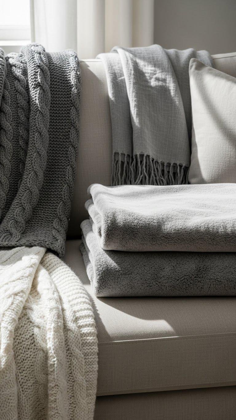 Mix a soft cable knit throw with a faux woolen blanket, drape one casually and fold another for contrast, and choose varied textures and weights so your space feels effortless, warm, and free.