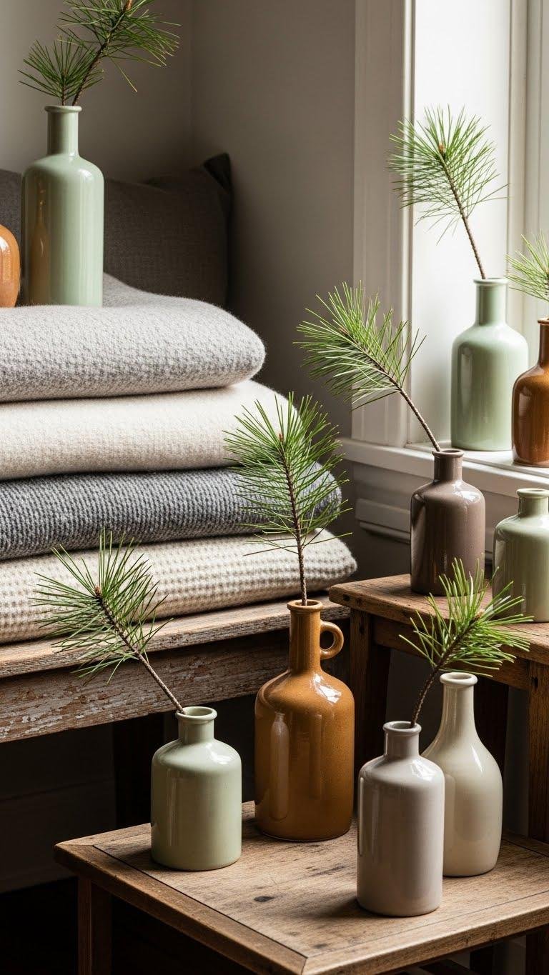 Layering throws sets a soft, lived-in stage—now bring in small, unexpected accents to complete the scene. Hunt thrift shops for glass and ceramic vases, then curate vintage bottle arrangements with single pine stems. You’ll lean into minimalist branch displays, letting texture and scent do the work.