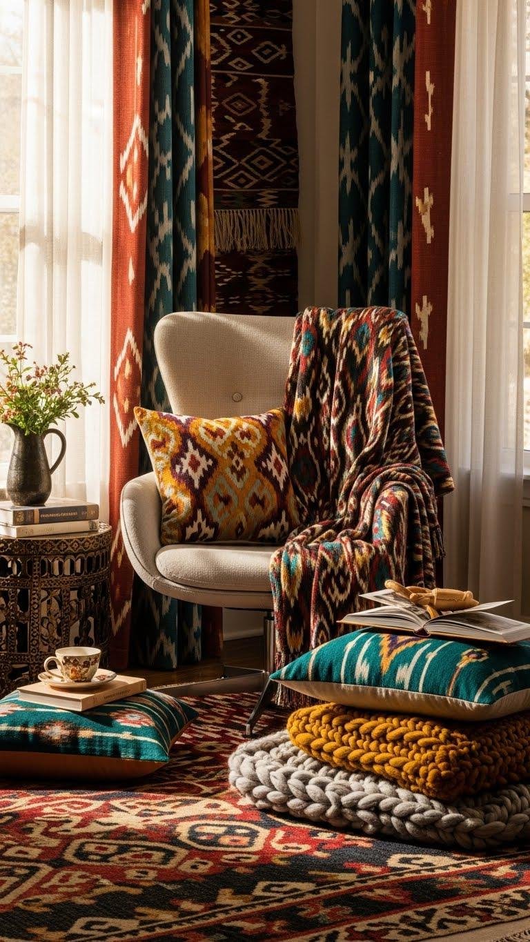 Mix bold textiles—kilims, ikats, chunky knits—and embrace pattern layering to create movement without chaos. You’ll balance scale and color, pick a unifying hue, and let spirited prints express freedom while keeping the space cohesive and inviting.