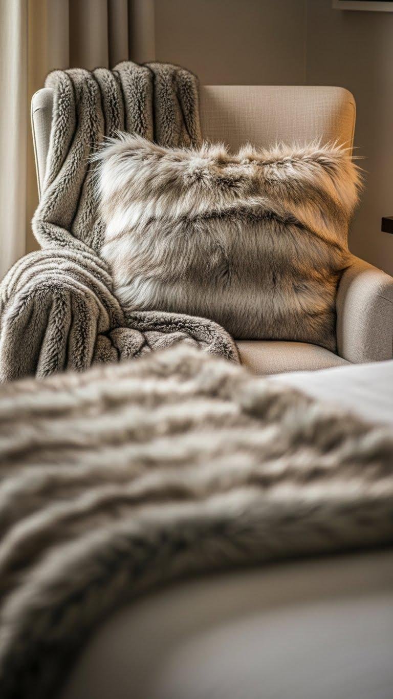 Often you’ll reach for a faux fur throw to instantly raise the room’s comfort level and add visual warmth. Drape vintage faux throws over armchairs or at foot of bed for effortless glamour. Pair with faux fur pillows for layered texture and tactile contrast.