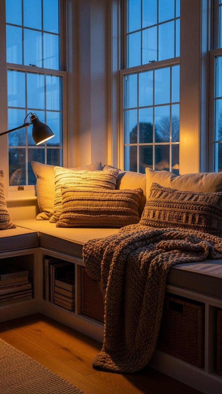 Curl up and claim a corner with deep-seated seating that invites you to linger through long winter evenings. Create a liberated retreat: tuck a cushioned daybed into window alcoves, flank it with bookcase benches for storage and easy access, and layer a chunky throw plus a reading lamp.