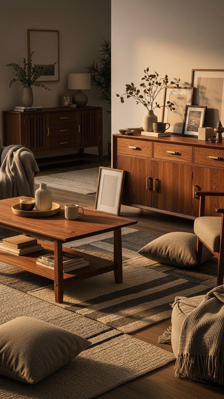 When you pair dark wood pieces with soft textiles and warm metals, the room instantly feels lived-in and inviting—think walnut coffee tables, oiled oak sideboards, and espresso frames that ground lighter fabrics and layered rugs.