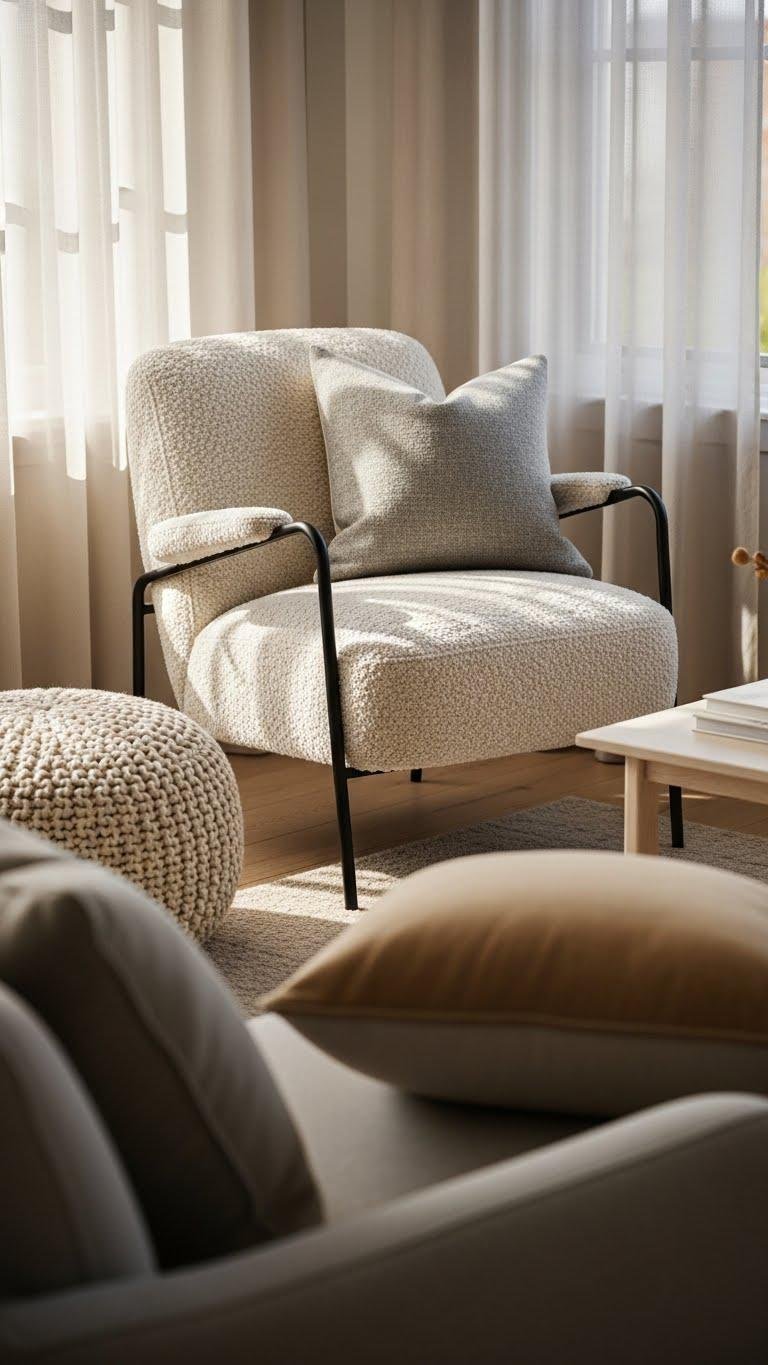 Swap in a bouclé or wool accent chair to instantly soften the room’s look and add tactile warmth that photos and pillows can’t replicate. Choose clean lines and neutral tones to keep things airy while inviting touch. Pair with a bouclé ottoman or wool pouf for flexible seating and lounging freedom. You’ll create a liberated, cozy corner that’s stylish and effortlessly lived-in.