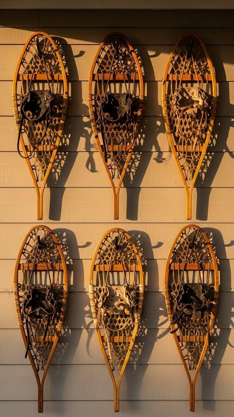 If you want a statement piece that feels both rustic and refined, mount vintage or replica snowshoes in a tidy pattern to form an eye-catching accent wall on your porch. You’ll mix a genuine vintage snowshoe with painted snowshoe accents, showcase weathered leather straps, and use sturdy hanging hooks. The result feels adventurous, curated, and effortlessly free-spirited.