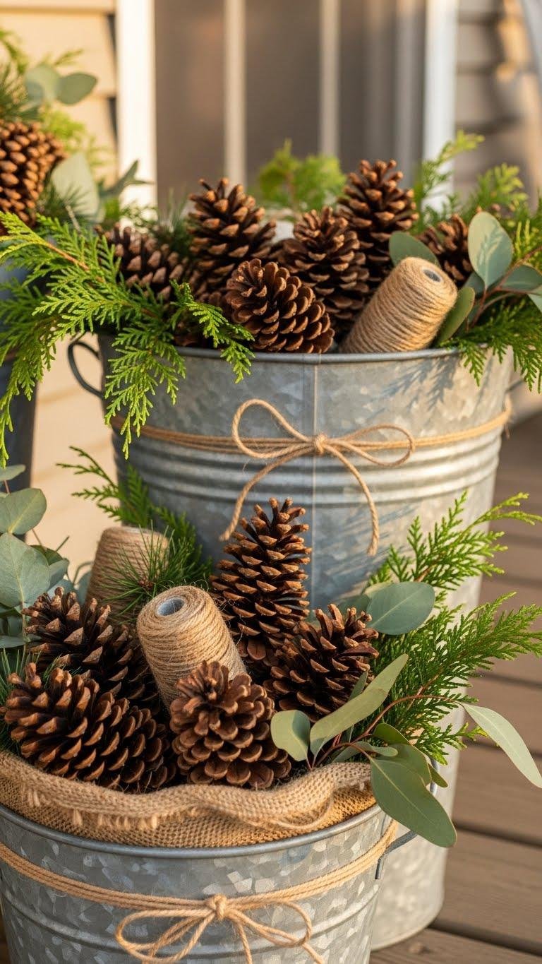 With a few simple pinecone picks tucked into galvanized planters, you give your porch an evergreen touch that feels curated not contrived. Choose varied pinecones, add sprigs of cedar and eucalyptus for seasonal scents, and let rustic textures — twine, burlap liners — contrast metal. Place asymmetrically for effortless charm, refresh picks seasonally, and enjoy a liberated, low-maintenance winter vignette.