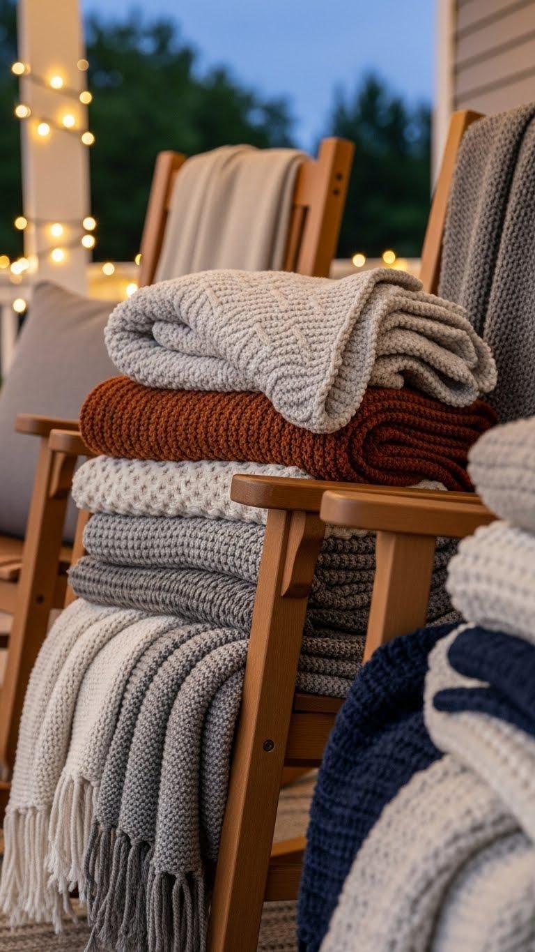 You’ll want a stack of soft, fuzzy blankets draped over your rockers to invite neighbors and family to linger a little longer on chilly porch evenings. Choose neutral palettes and bold accents, mixing knit textures for visual depth and durable fibers for warmth. After rocker restoration, position blankets within easy reach, fold corners neatly, and let freedom-focused styling signal relaxed hospitality.