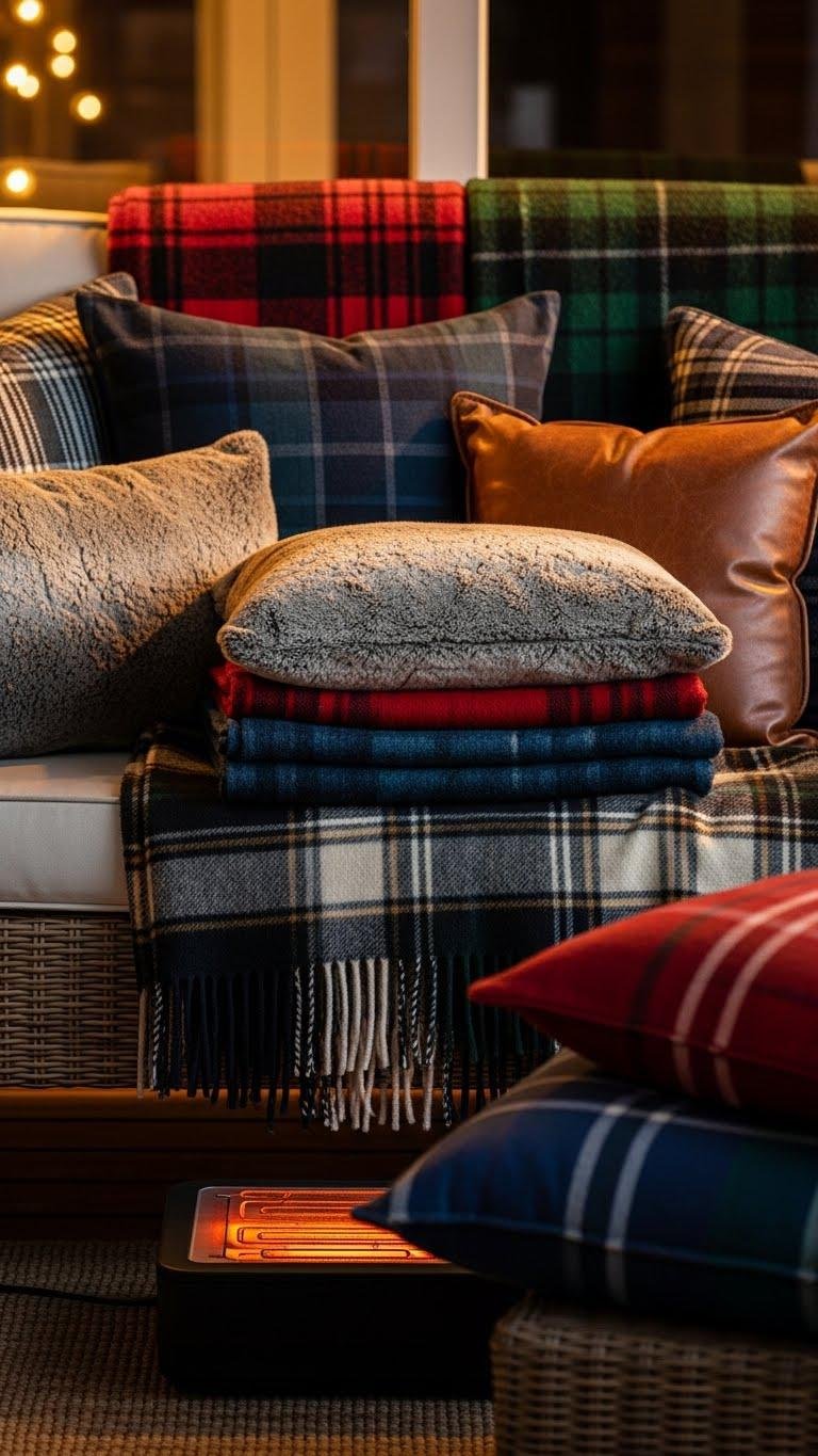 You’ll choose complementary tartan napkin hues, mix textures—wool, faux-shearling, leather—and arrange pillows by size for balance. Add a discreet heated footrest for warmth; the vignette feels polished, cozy, and effortlessly free-spirited.
