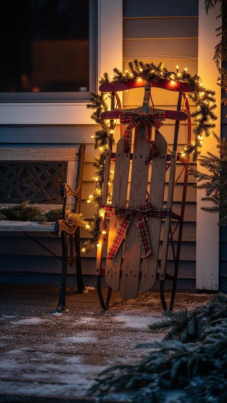 After the garland’s warm glow sets the mood, tuck a vintage red sled against the porch wall or lean it beside a bench to add nostalgic character and a pop of seasonal color. Let the exposed wood patina and antique runners show; secure plaid ribbons for contrast. You’ll anchor a bold, liberated look that’s curated, effortless, and ready for cozy winter gatherings.