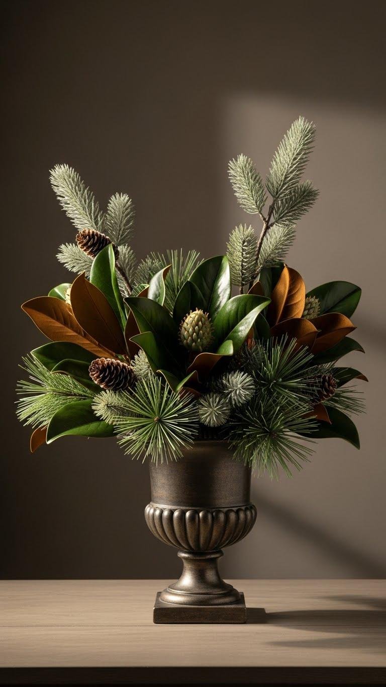 Move from the rustic texture of pinecones to the glossy elegance of magnolia leaves paired with faux pine sprigs for a look that feels both refined and approachable.