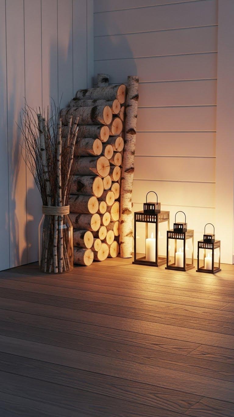 Stack birch logs neatly against the porch wall and you’ll instantly add clean, textured warmth that feels both contemporary and timeless. Arrange a birch centerpiece on top or beside the stack and place a lantern trio at varying heights for glow and rhythm. You’ll balance rustic charm with modern lines, creating an open, unconfined entry that invites lingering evenings and easy, stylish maintenance.
